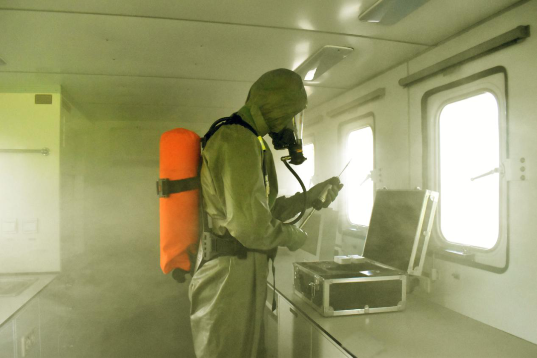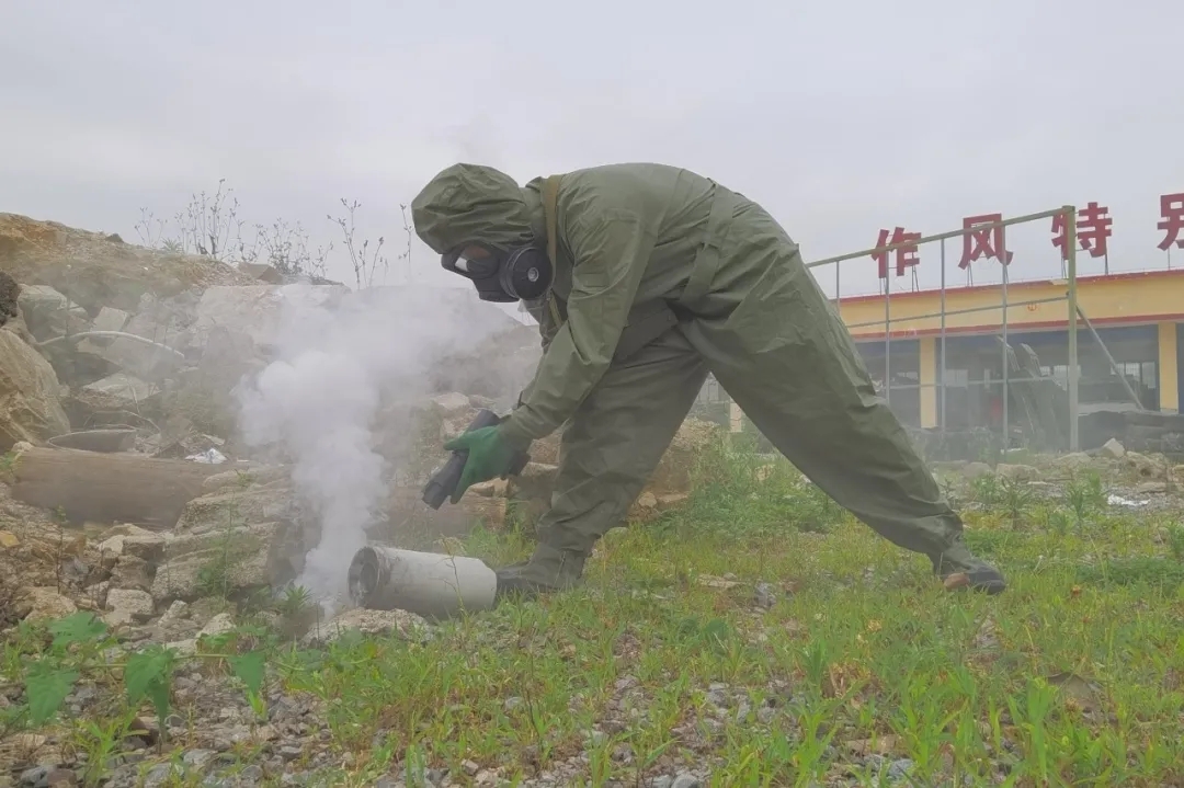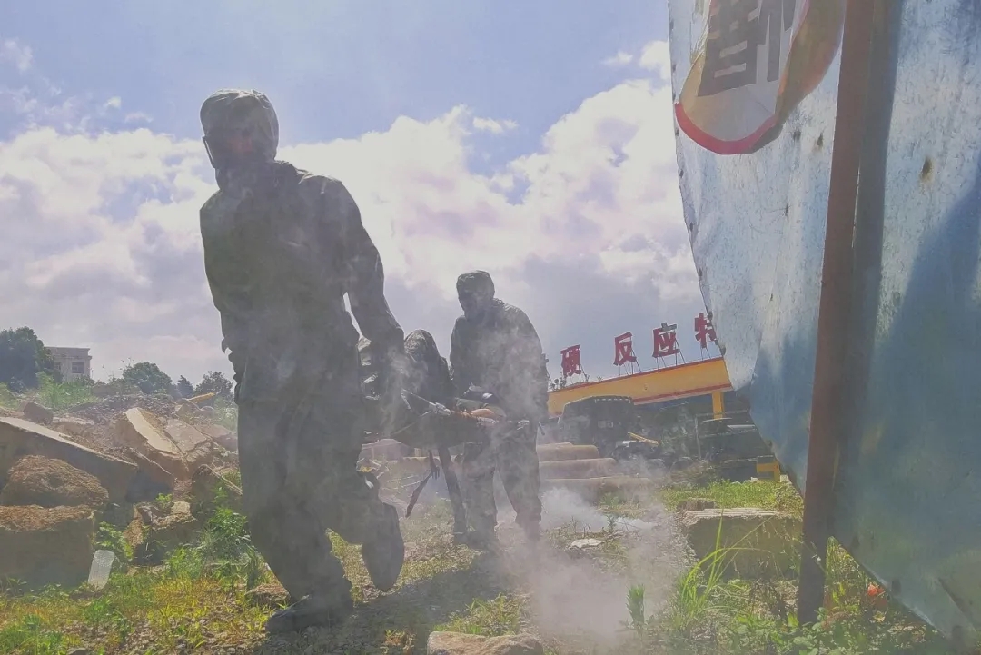 与此同时,堵漏组携带液压封堵钳和方形木楔成功对泄漏源堵漏,化验员陈玉仙拿到样品后立刻展开化验工作——“报告队长,经化验,毒气种类为氯气,浓度为中等浓度,完毕!”“洗消组,迅速前出对污染区域实施洗消!”