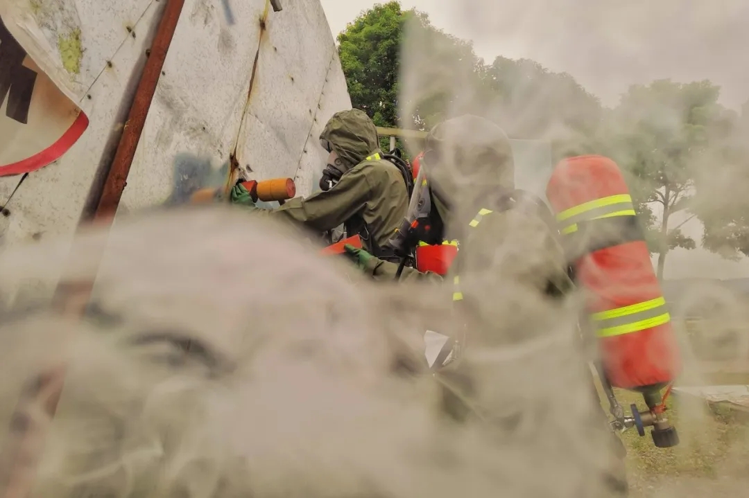 “各组注意!据上级通报,8时30分,驻地附近某化工厂发生有毒化学物品泄露,并伴有大量烟雾,严重威胁人民群众生命财产安全,现上级命令我中队立即奔赴现场进行处置……”一场化学事故应急救援演练随即打响。