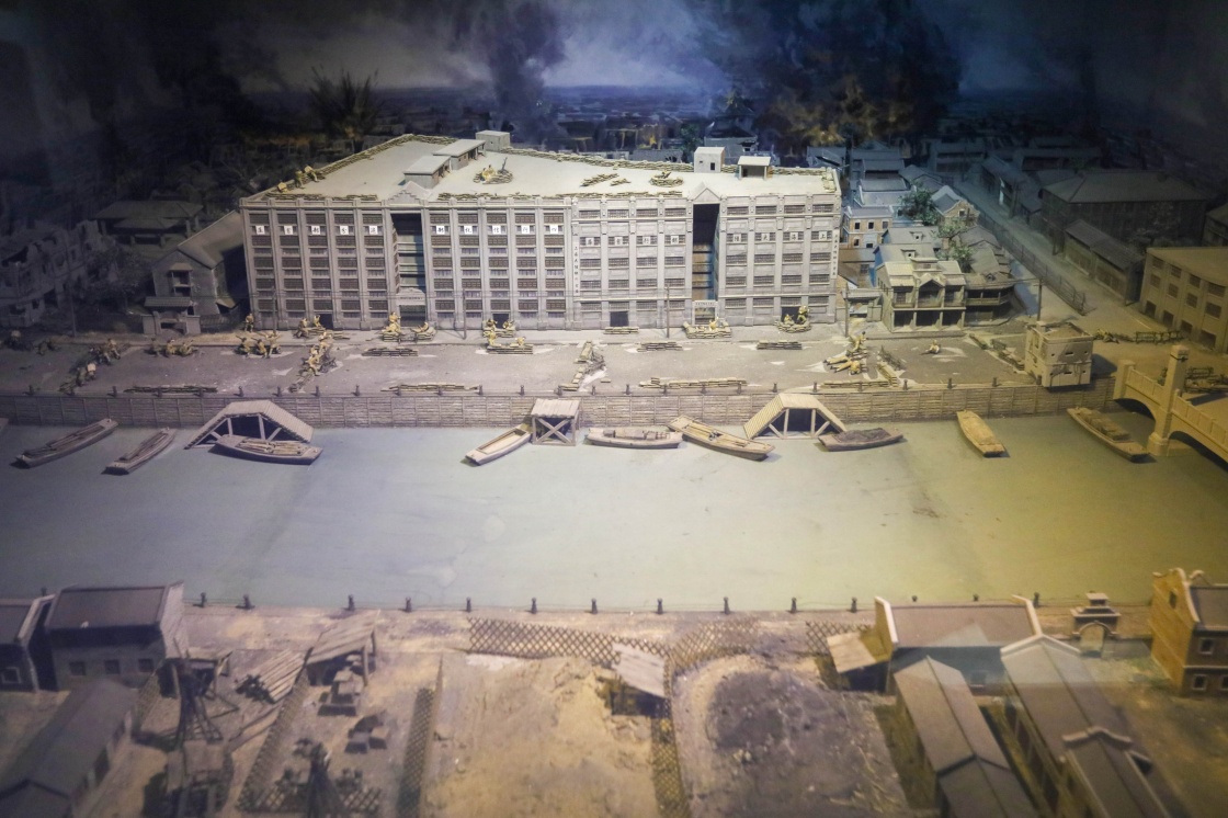9月16日拍摄的还原四行仓库历史场景的模型。