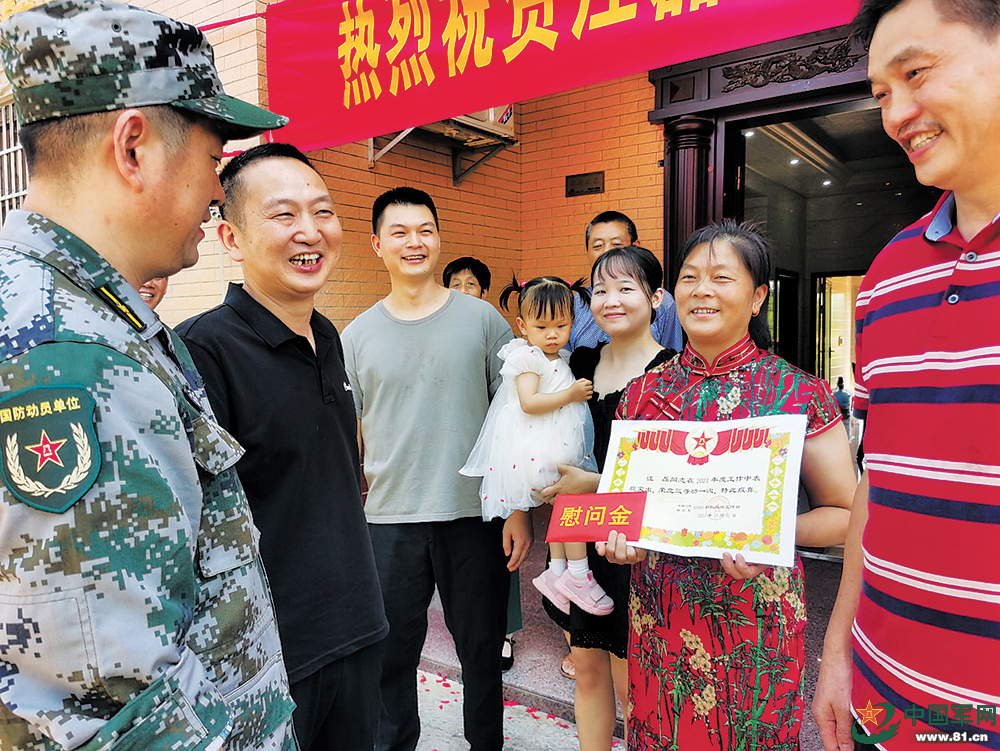 “八一”前夕,湖南省醴陵市人武部与退役军人事务局联合开展“送喜报”活动,为立功军人的家庭送去喜讯和祝福。 江 磊摄