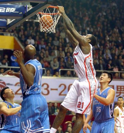 1月12日,广东东莞银行队球员鲍威尔(右二)在比赛中扣篮。