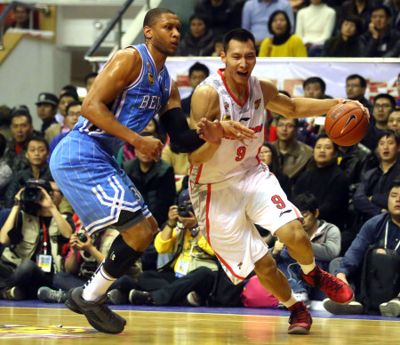 1月12日,广东东莞银行队球员易建联(右)在比赛中带球进攻。