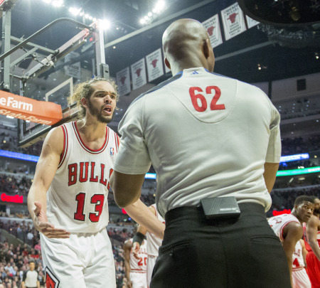 1月13日,公牛队球员诺阿(左)在比赛中与裁判争辩。