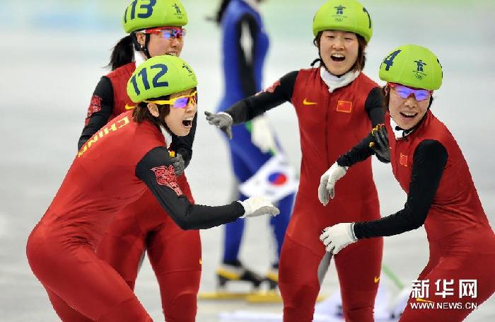 图为2010年2月24日,在温哥华冬奥会短道速滑女子3000米接力赛中,由王濛(前左)、周洋(右)、张会(左上)和孙琳琳组成的中国队以4分06秒610的成绩打破世界纪录并夺得金牌。在本届冬奥会上,中国女子短道速滑队包揽了所有四枚金牌,而多年来的霸主韩国队一无所获。