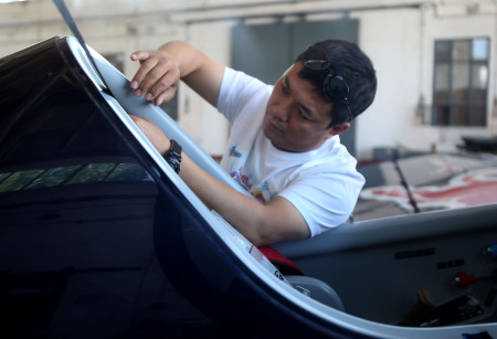 图为赵伟在飞行前调整驾驶舱座椅(5月26日摄)。