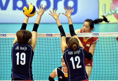 8月15日,中国队球员朱婷(右)在比赛中扣球。新华社记者 卢炳辉 摄