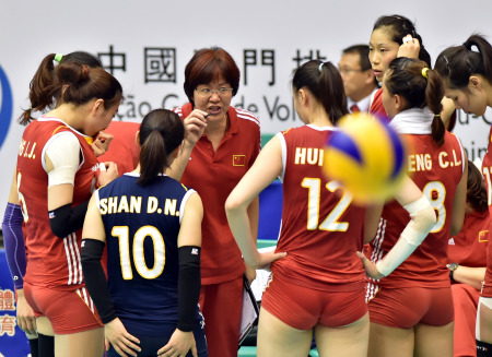 8月15日,中国队主教练郎平(中)在休息时指导球员。新华社记者 卢炳辉 摄
