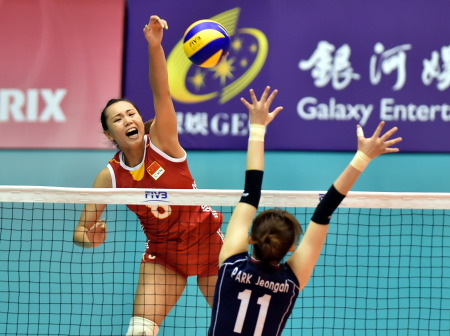 8月15日,中国队球员曾春蕾(左)在比赛中扣球。新华社记者 卢炳辉