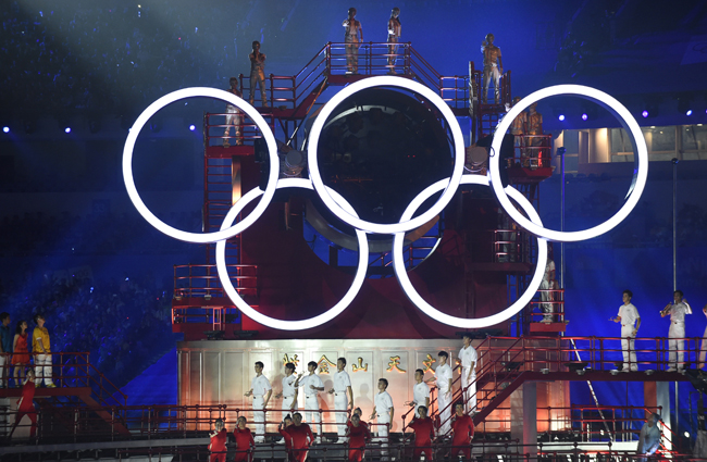 8月16日,第二届夏季青年奥林匹克运动会开幕式在南京奥林匹克中心举行。图为开幕式上的奥运五环(8月16日摄)。新华社记者 岳月伟 摄