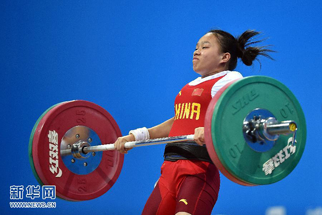8月17日,中国选手蒋惠花在比赛中。当日,2014南京青奥会举重项目比赛在南京国际博览中心开赛。在女子48公斤级比赛中,中国选手蒋惠花以193公斤总成绩夺冠。新华社记者 郭程摄