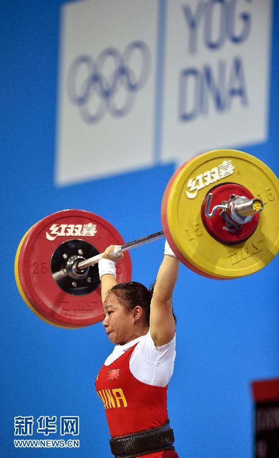 8月17日,中国选手蒋惠花在比赛中。当日,2014南京青奥会举重项目比赛在南京国际博览中心开赛。在女子48公斤级比赛中,中国选手蒋惠花以193公斤总成绩夺冠。新华社记者 郭程摄