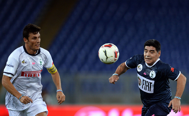 9月1日,马拉多纳(右)与萨内蒂在比赛中争抢。