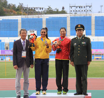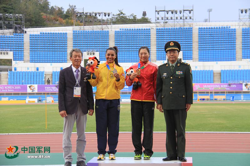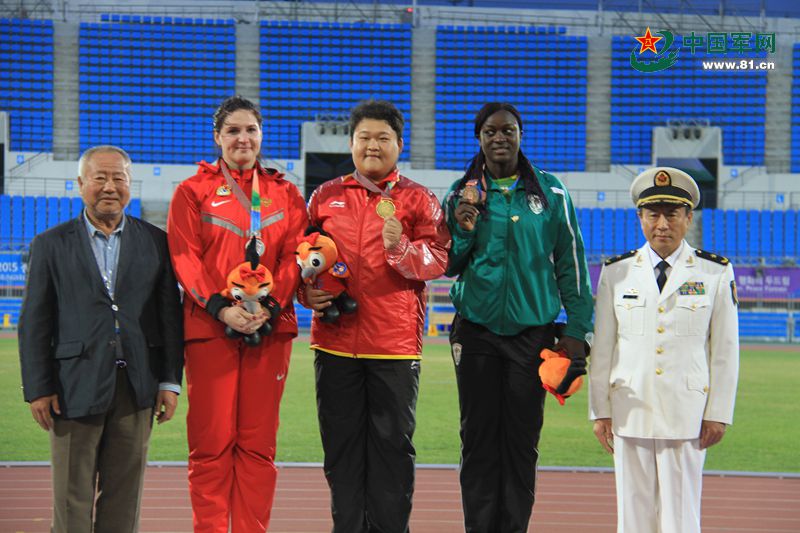 世界军人运动会组委会和中国代表团领导为获得六军会中国军团第二金的女子铅球运动员高阳(中)颁奖。解放军报记者 张天南 摄