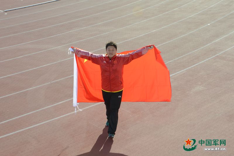 这一愿望终于在今天下午举行的女子铅球比赛中得以实现。在女子标枪选手张莉勇夺中国军团首金后不到10分钟,赛场上就再次传来捷报:18.14米!高阳斩获中国军团第二金。这是22岁的高阳第一次参加世军会,拿到冠军后,她的第一个动作就是身披国旗走向看台。她激动地说:“作为一名军人,能在世界军人运动会上夺金,这种幸福感和自豪感要比参加别的赛事更加强烈。”