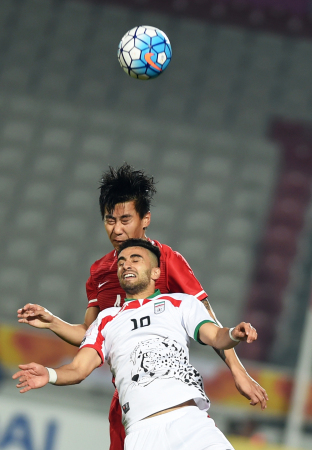 1月18日,中国国奥队球员金洋洋(上)与伊朗国奥队球员阿萨兰·莫塔哈里在比赛中拼抢。