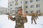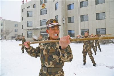 近日,山东半岛普降大雪。武警烟台市支队积极开展雪地体能训练,锤炼官兵战斗作风。图为官兵进行棍术练习。