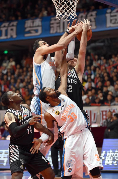 3月16日,四川金强队球员哈达迪(上左)在比赛中与辽宁药都本溪队球员兰多夫(上右)拼抢。