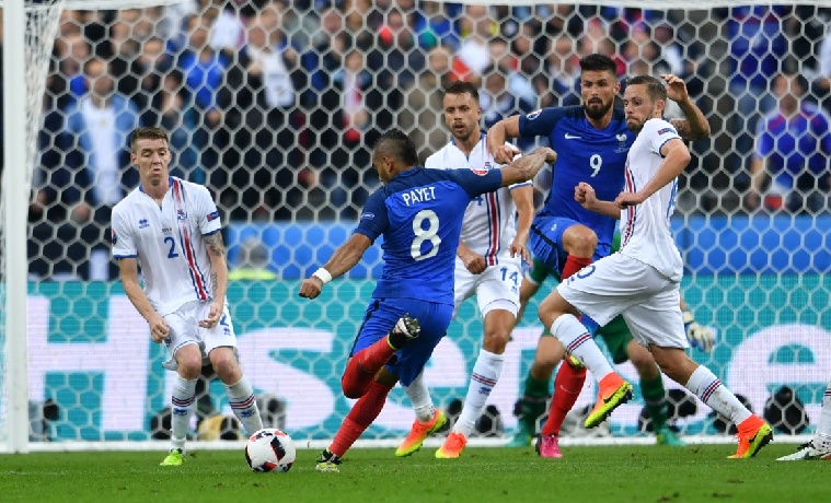 7月3日,在法国巴黎进行的2016年欧洲足球锦标赛四分之一决赛中,法国队以5比2战胜冰岛队,晋级四强。 新华社记者陶希夷摄