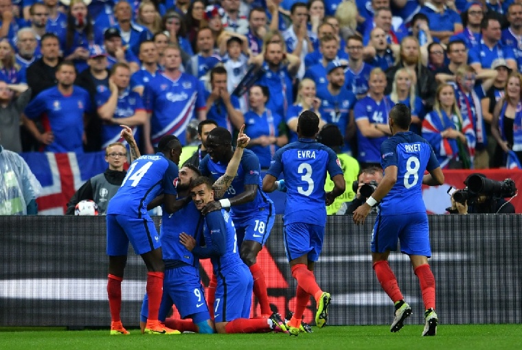 7月3日,法国队球员吉鲁(左二)与队友在比赛中庆祝进球。