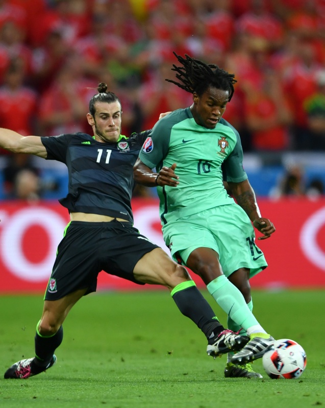 7月6日,葡萄牙队球员雷·桑切斯(右)在比赛中和威尔士队球员贝尔拼抢。