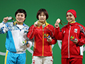 8月10日,中国选手向艳梅(中)、哈萨克斯坦选手扎帕库尔(左)和埃及选手艾哈迈德在颁奖仪式上展示奖牌。新华社记者李明摄