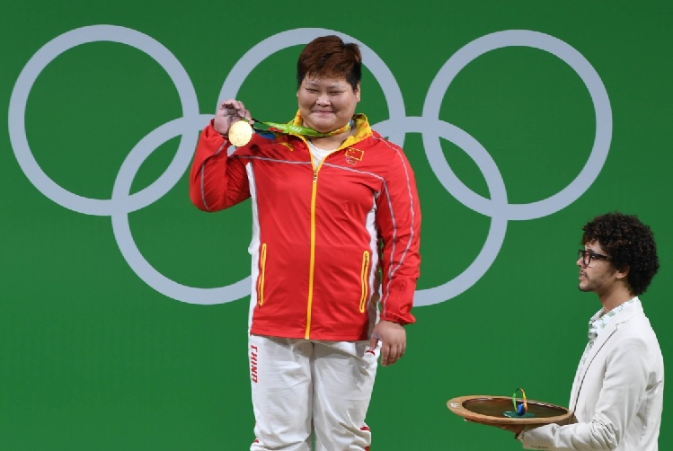 8月14日,中国选手孟苏平在颁奖仪式上展示金牌。 新华社记者王毓国摄