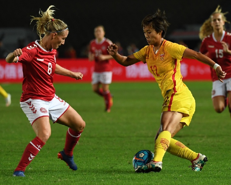 10月24日,中国队球员王霜(右)在比赛中带球突破。新华社记者陈诚摄
