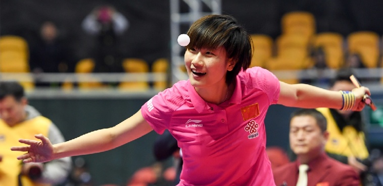 11月24日,国家队选手丁宁在表演赛上发球。新华社记者李博摄