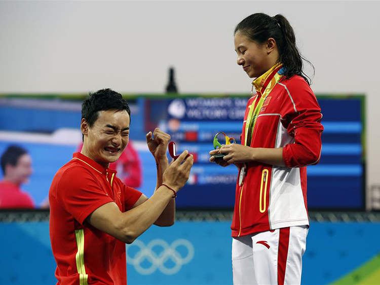 竞技场上不只有速度力量的比拼引人关注,在一场酣畅淋漓的比赛过后,体坛眷侣在竞技场上大秀恩爱的画面同样让人为之动容。这是2016年8月14日,中国跳水队队员秦凯(左)在里约奥运会跳水女子3米板颁奖仪式上向女友何姿求婚。 新华社记者丁旭摄