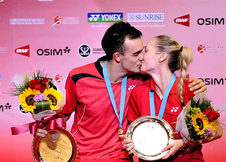 这是2013年11月24日,英国组合爱德考克(左)/怀特在香港羽毛球公开赛混双颁奖仪式上亲吻。 新华社记者李莹摄