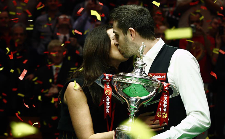 这是2014年5月5日,英格兰选手塞尔比(右)在2014年斯诺克世锦赛颁奖仪式上亲吻妻子维基。 新华社记者殷刚摄