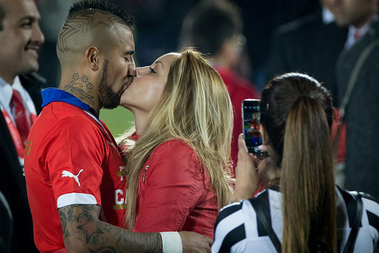 这是2015年7月4日,智利队球员比达尔(左)在2015美洲杯决赛之后亲吻他的妻子。当日,在智利首都圣地亚哥的国家体育场举行的2015美洲杯决赛中,智利队和阿根廷队在90分钟及加时赛中以0比0战平,在点球大战中智利队以4比1战胜阿根廷队,夺得本届美洲杯冠军。新华社发(梅拉摄)