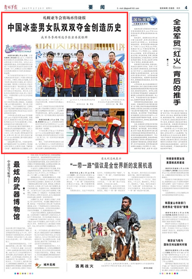 包揽金牌实属不易,中国冰壶男队选手臧嘉亮谈到了自己的期待,“希望通过我们的努力,让更多人知道、了解和练习冰壶”。臧嘉亮的队友巴德鑫说,亚冬会夺冠只是实现了一个“小目标”,下一步是打好积分赛,争取到平昌冬奥会上为国争光。