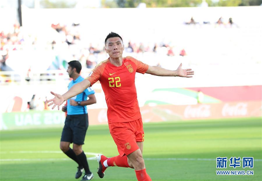 1月7日,中国队球员于大宝(前)在比赛中庆祝进球。 当日,在阿联酋艾因举行的2019年亚洲杯足球赛C组小组赛中,中国队以2比1战胜吉尔吉斯斯坦队。 新华社记者曹灿摄