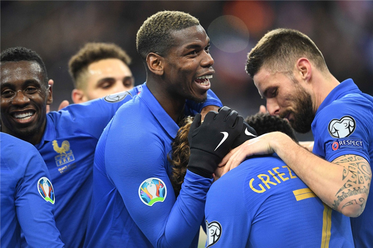 3月25日,法国队球员格列兹曼(右二)进球后与队友庆祝。新华社发(杰克·陈摄)