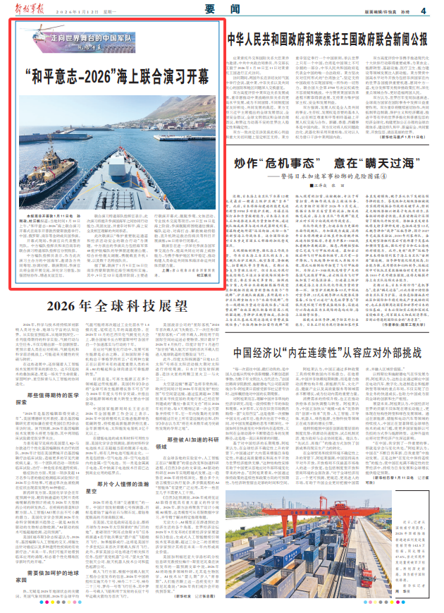 解放军报南非开普敦1月11日电 孙刚政、杜江帆报道:当地时间1月10日上午,“和平意志-2026”海上联合演习开幕式在南非开普敦西蒙斯敦港举行,中国、俄罗斯、南非等金砖成员国参演。
