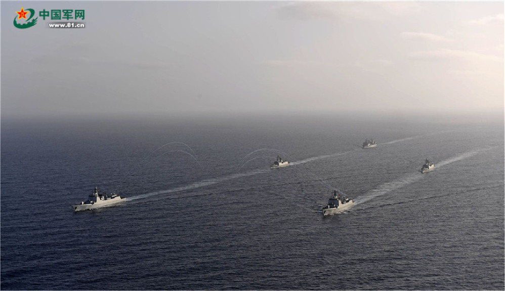 海军34、35批护航编队在亚丁湾、索马里海域举行分航仪式。图为太原舰、银川舰同时发射3发绿色信号弹。江山摄