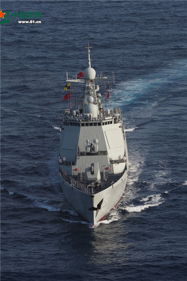海军34、35批护航编队在亚丁湾、索马里海域举行分航仪式。图为太原舰官兵在甲板上整齐列队。江山摄