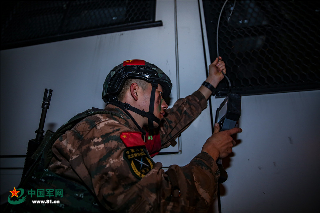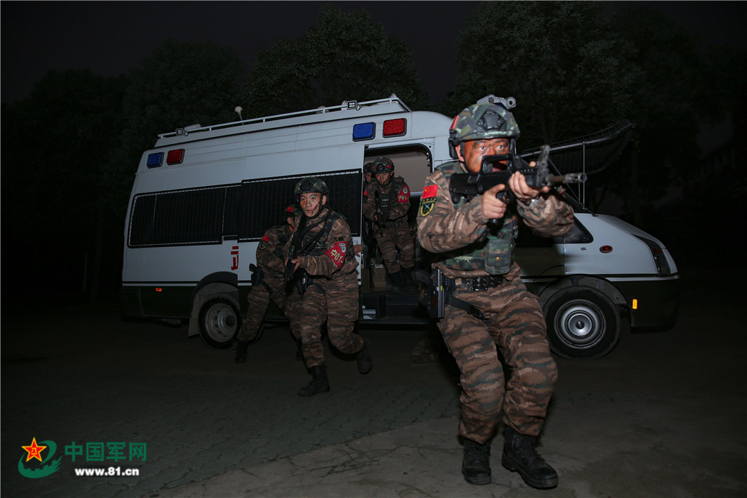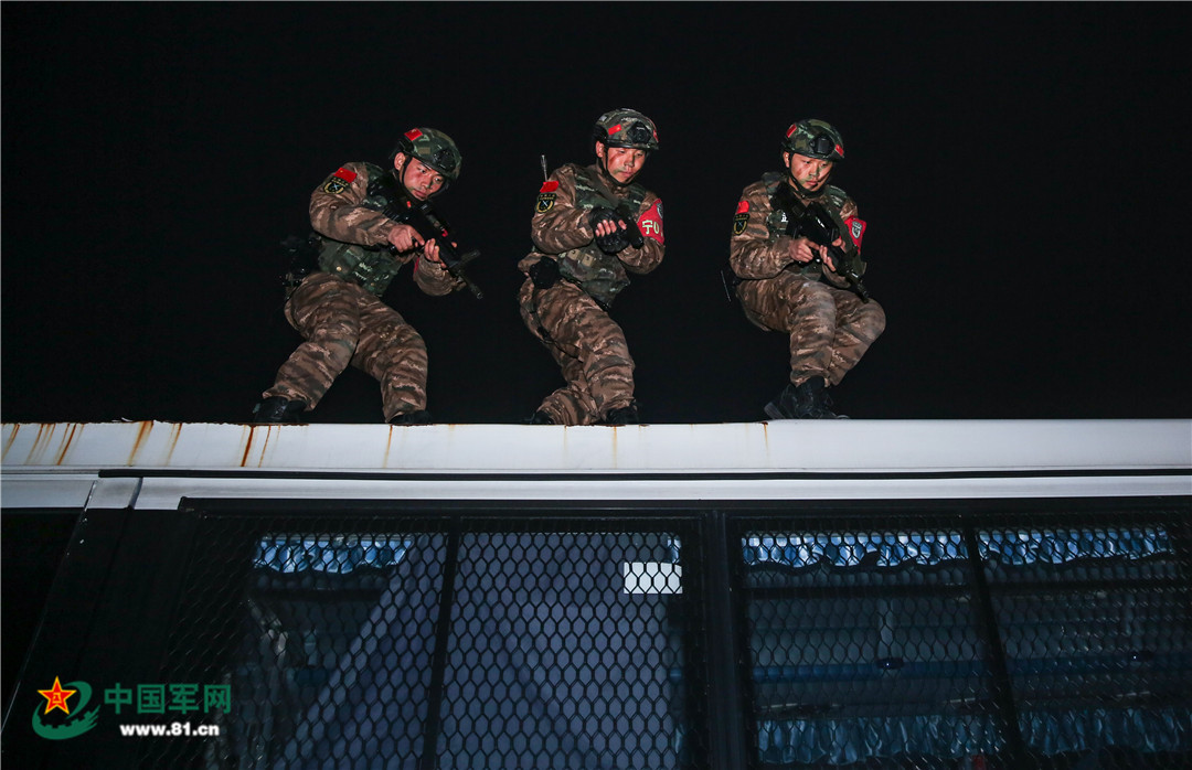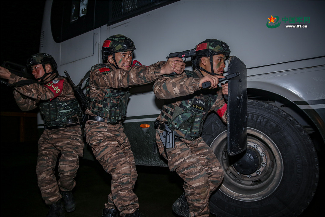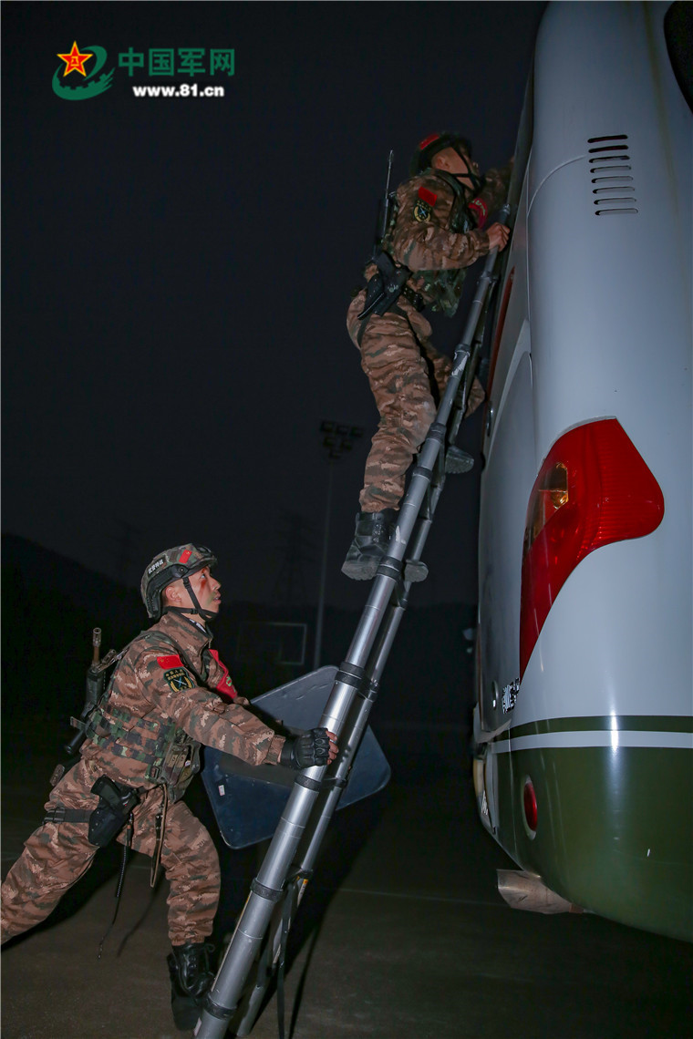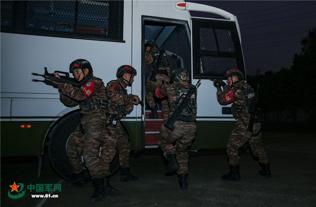 “接上级通报,有‘暴恐分子’在高速路口劫持一名‘人质’藏匿于大巴车内,命我部迅速前往处置……”这是武警宁波支队特战分队开展以实战为背景的夜间大巴车反劫持战斗演练中的一幕。