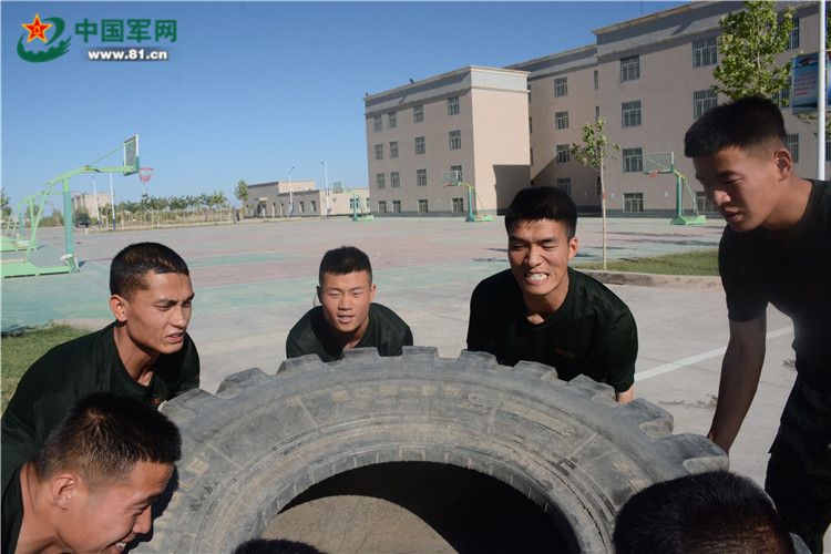 特战官兵在驻训点开展托举原木、轮胎等体能训练。