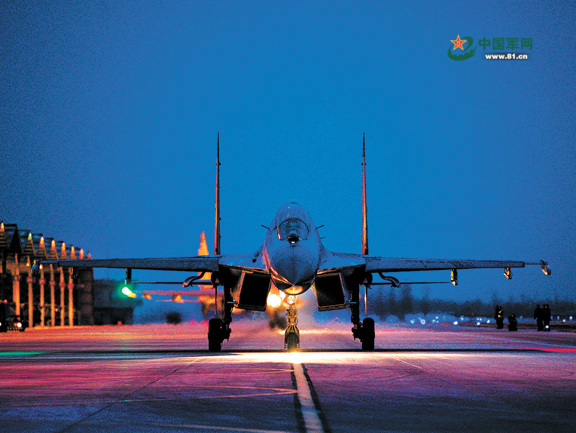 夜幕降临,完成昼间飞行训练的战机陆续返航,在进行检修、加油后随即转入夜间训练。