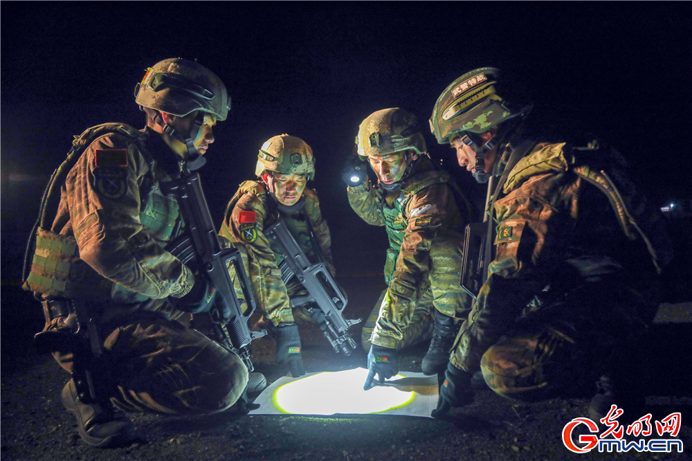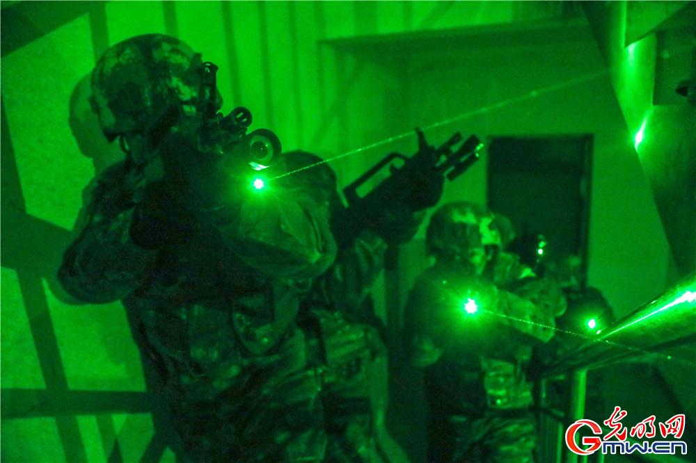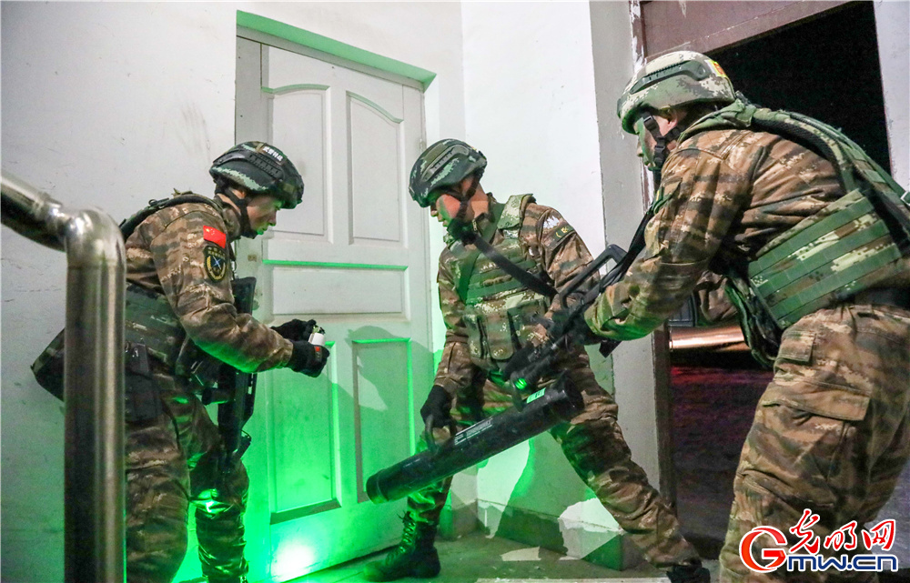 “接上级通报,19时30分,有两名‘暴恐分子’劫持一名‘人质’藏匿于X居民楼内,命我部迅速前出处置……”这是武警甘肃总队甘南支队特战分队开展以实战为背景的夜间城市反恐处突演练中的一幕。