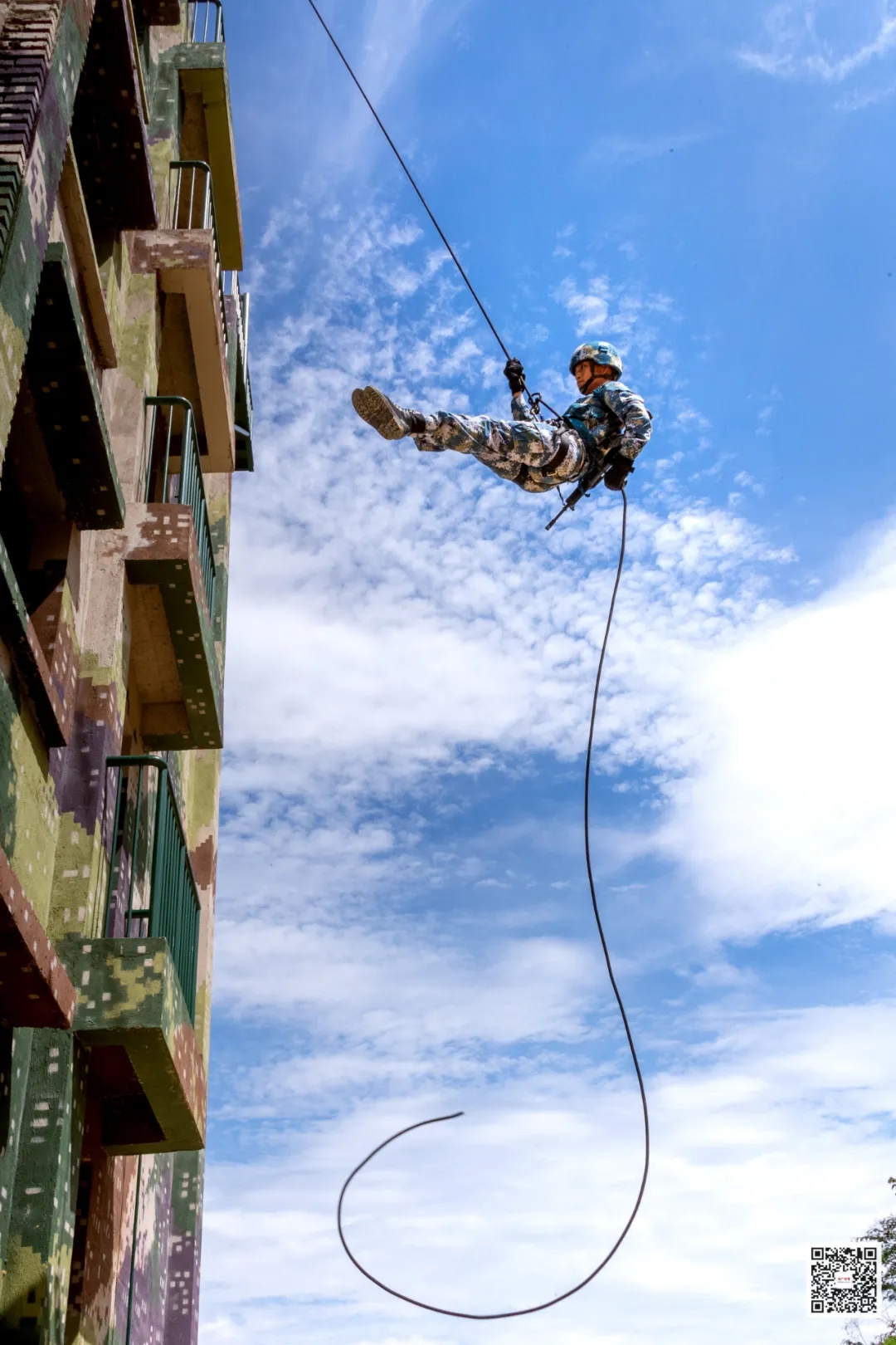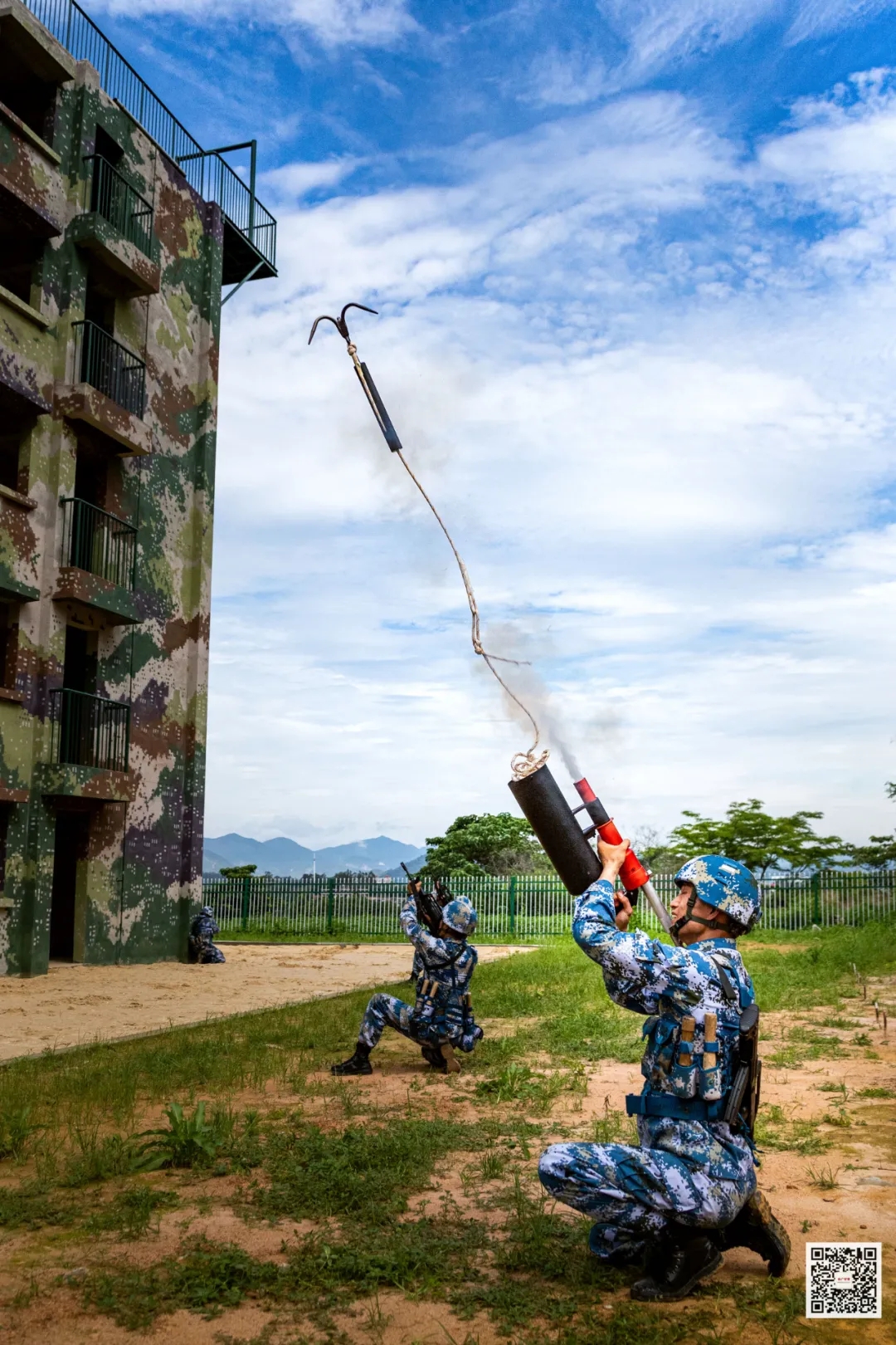 突击组官兵先利用锚钩抛射器
