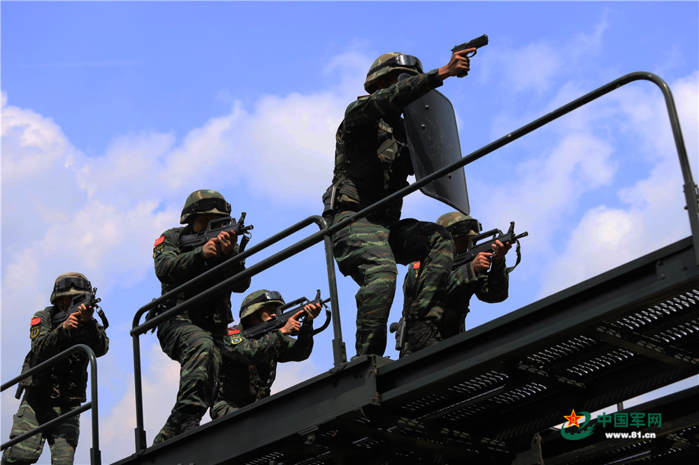 2018年9月5日,武警广西总队机动支队特战队员利用攀登突击车向“暴恐分子”藏匿的楼房发起突击。