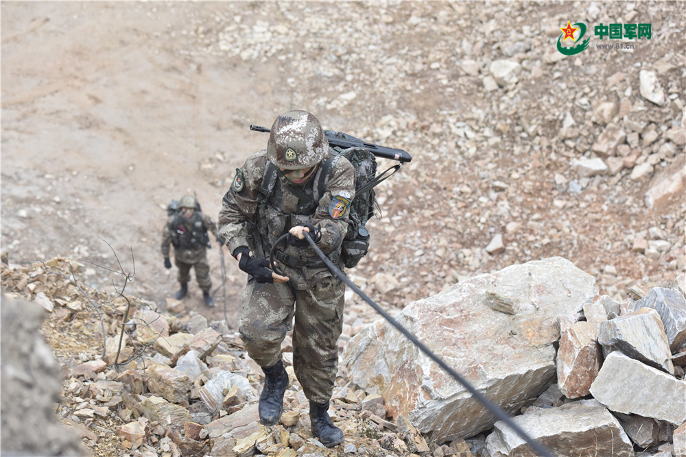特战队员正在攀爬断崖。
