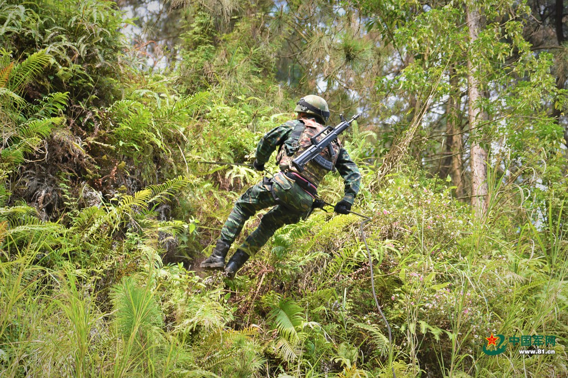 特战队员利用野外陡峭山崖进行下滑训练。