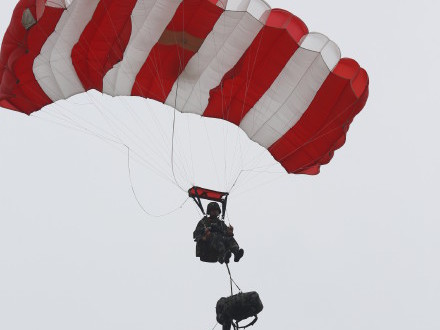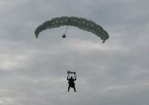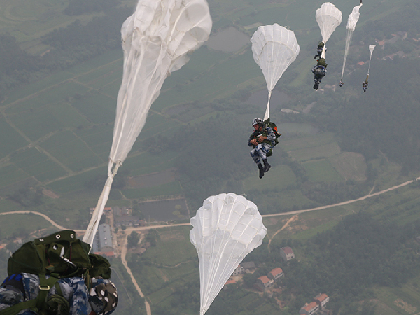 陆军第26集团军某特战旅特战队员在陌生地域利用某型翼伞进行全装跳伞,提高部队的整体作战能力。