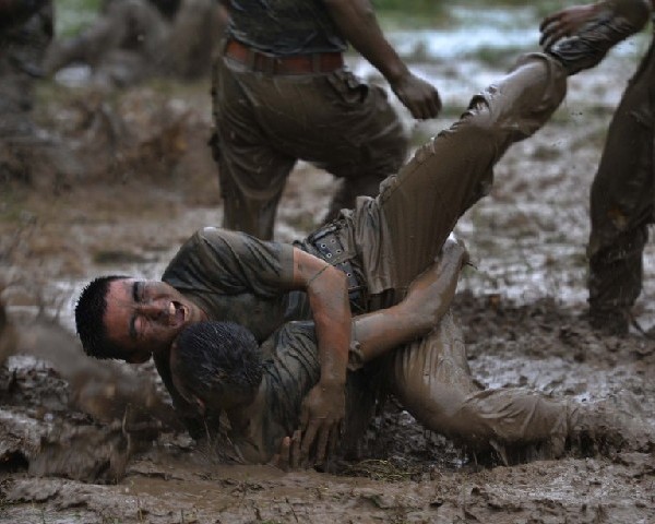 7月7日,武警重庆总队特战队员在完成山地5公里全副武装越野后,立即在山地泥潭中进行对抗训练。
