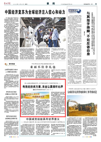 让我印象最深的,是中国在扶贫工作中的深入程度。包括中国军队在内的扶贫工作人员,深入到村庄、社区,挨家挨户了解贫困人口的实际情况。这样深入细致的调查,让扶贫工作很有针对性。也许你很有能力去帮助那些贫困的人,但是你的解决方案并不见得是他们需要的。比如,有些地区需要道路建设,有些地区需要清洁饮用水,有些地区需要发展教育……这些具体的情况,只有认真倾听民众心声才能了解到。