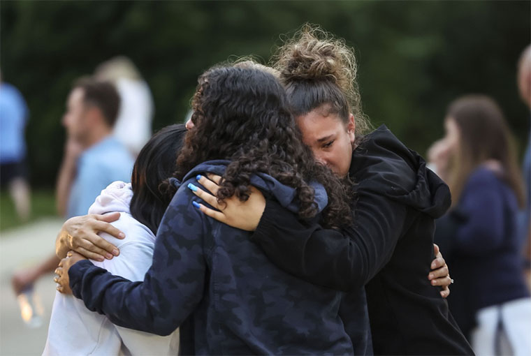 △ 7月5日,在美国伊利诺伊州海兰帕克市,人们悼念“独立日”枪击案遇难者时相互拥抱。 新华社发(乔尔·莱纳摄)